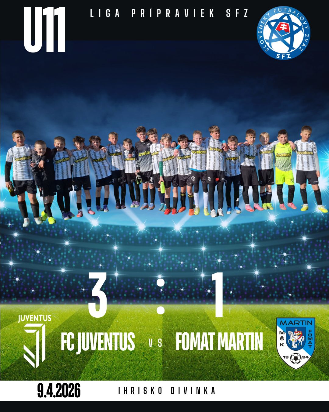 Zhodnotenie zápasu trénermi P. Papugom, J. Comorekom a T. Hollým: "Po kvôli počasiu zrušenom zápase v Námestove, konečne aj pre nás začala jarná časť ligy prípraviek. Na ihrisku v Divinke sme privítali kvalitného a dobre technicky vybaveného súpera FOMAT Martin. Po zimnom období, ktoré je spojené s hrou na umelých trávnikoch, sme sa tešili na živú trávu. Boli sme zvedaví ako chalani zvládnu tento prechod, nakoľko je to veľký rozdiel v rýchlosti a presnosti hry. Bolo vidieť, že sa dosť hľadáme, no napriek tomu všetci podali veľmi bojovný výkon. Áno v celkovom súčte sme súpera síce porazili 3:1, ale čo je oveľa dôležitejšie a čo ukazuje správny charakter chalanov bolo, ako si celý čas pomáhali. Po vlastnom góle miesto vyčítania si chýb bežali podporiť spoluhráča. Uistili ho, že sa nič nedeje a on potom zvyšok času jazdil po ihrisku ako píla. Toto je dôležitejšie ako výsledok, ktorý nás samozrejme teší a ideme v našom nabitom kalendári ďalej."