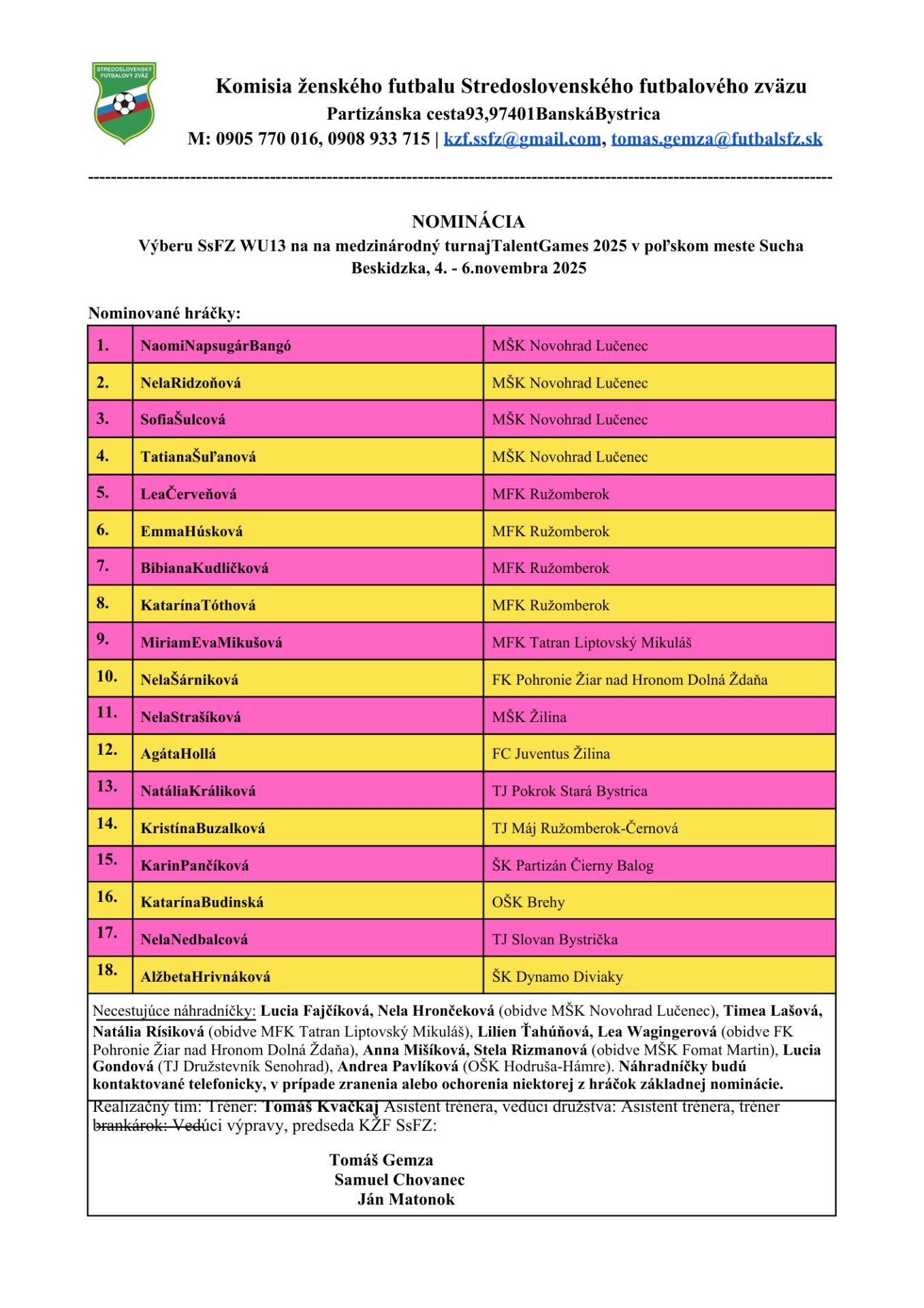 V NOMINÁCII VÝBERU SsFZ WU13 NA TURNAJ DO POĽSKA FIGURUJE AJ HRÁČKA NÁHO KLUBU AGÁTKA HOLLÁ. PRAJEME JEJ VEĽA ZDARU NA TURNAJI. AKO JE VIDIEŤ AJ DIEVČATÁ SA V NAŠOM KLUBE ÚSPEŠNE UČIA HRAŤ FUTBAL. GRATULUJEME.