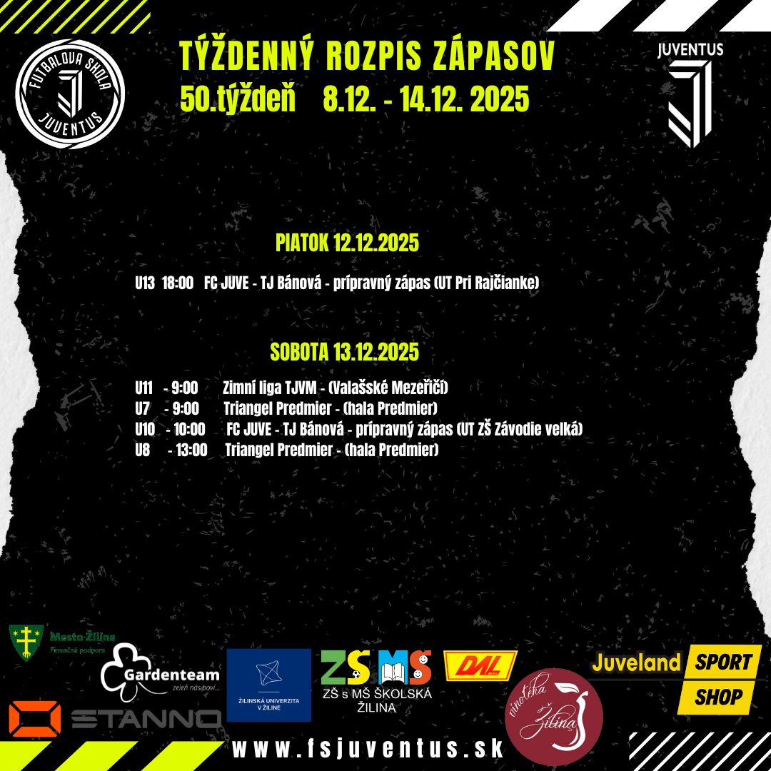 ROZPIS ZÁPASOV NA AKTUÁLNY TÝŽDEŇ 50.TÝŽDEŇ od 8.12. do 14.12.2025