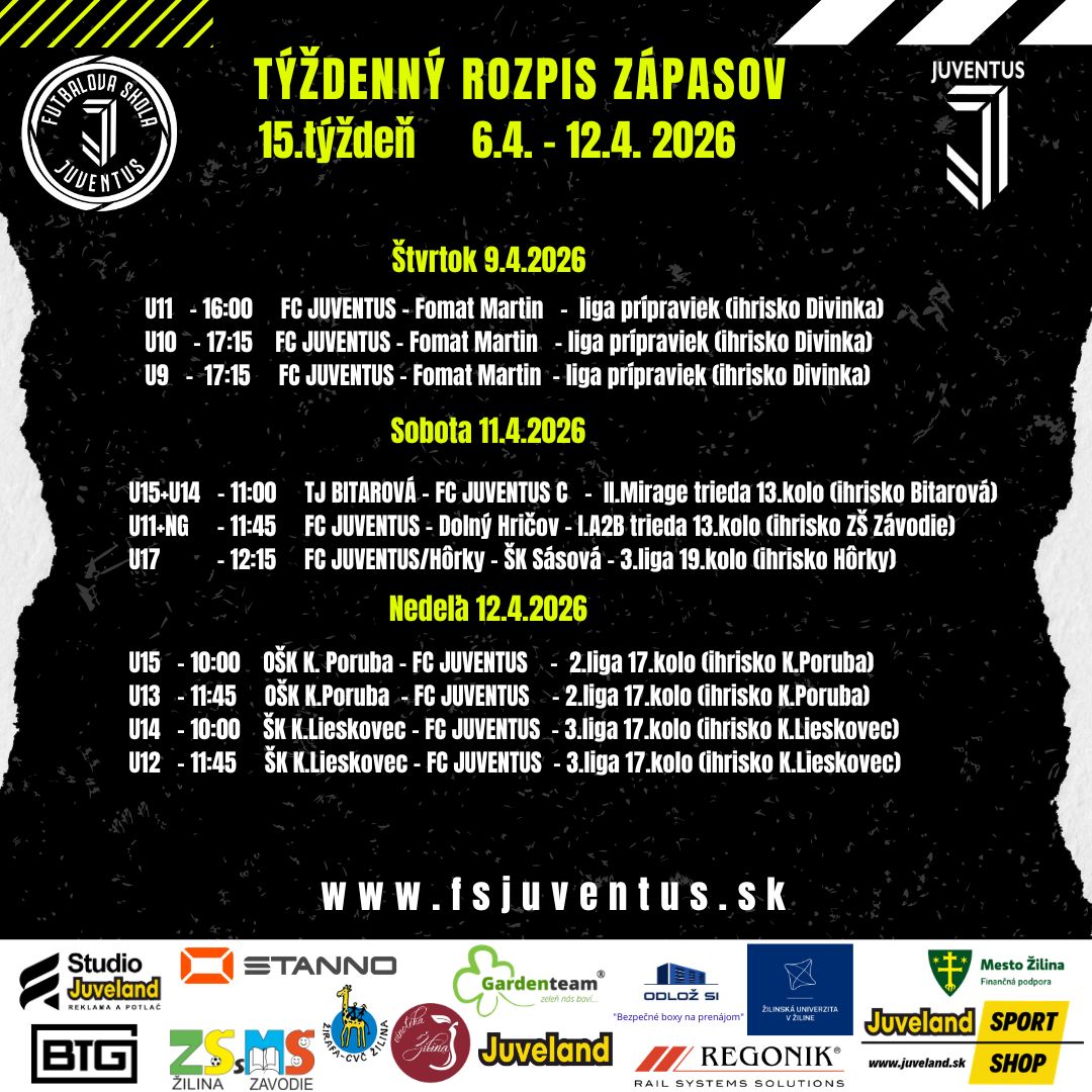 ROZPIS ZÁPASOV V 15 TÝŽDNI OD 6.4. DO 12.4.2026