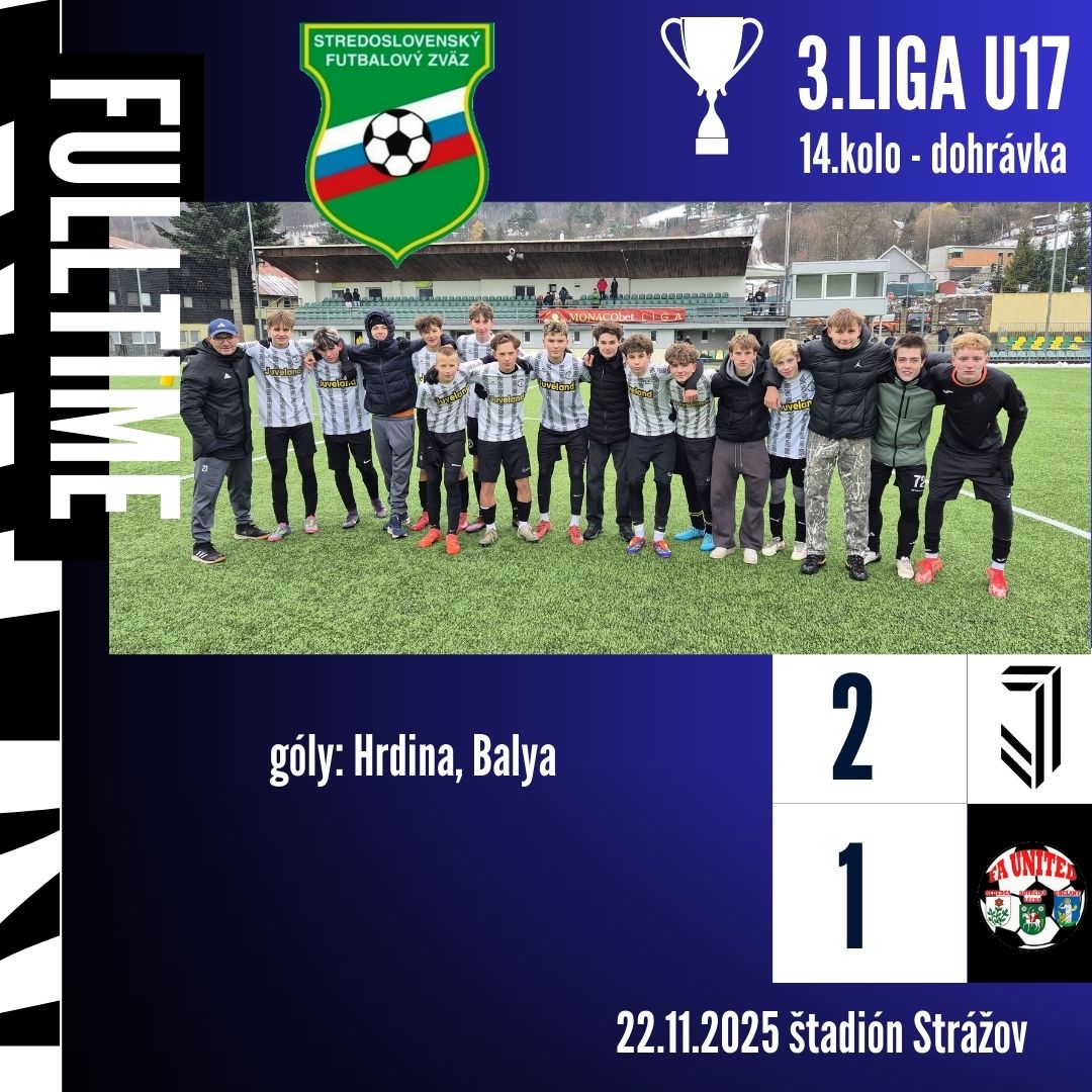ZÁVEREČNÝM VÍŤAZSTVOM V DOHRÁVKE 14.KOLA 3.LIGY SI CHLAPCI Z NAŠEJ U17 ZABEZPEČILI TO, ŽE PREZIMUJÚ NA KRÁSNOM 3.MIESTE V TABUĽKE.