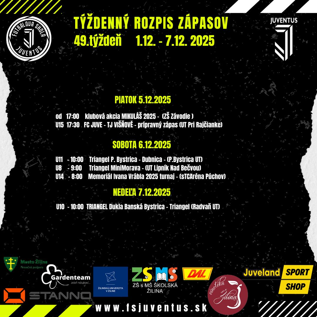 ROZPIS ZÁPASOV NA AKTUÁLNY TÝŽDEŇ 49.TÝŽDEŇ od 1.12. do 7.12.2025